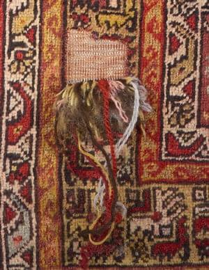 Mais la couleur ne fait pas tout, la texture ne doit entraîner aucune dissonance avec celles du tapis en soins chez nous. C’est pourquoi nous travaillons uniquement avec des laines appropriées, en respectant les techniques de tissage propres à la provenance du tapis.