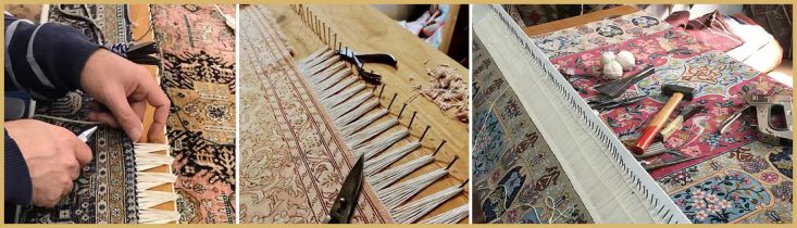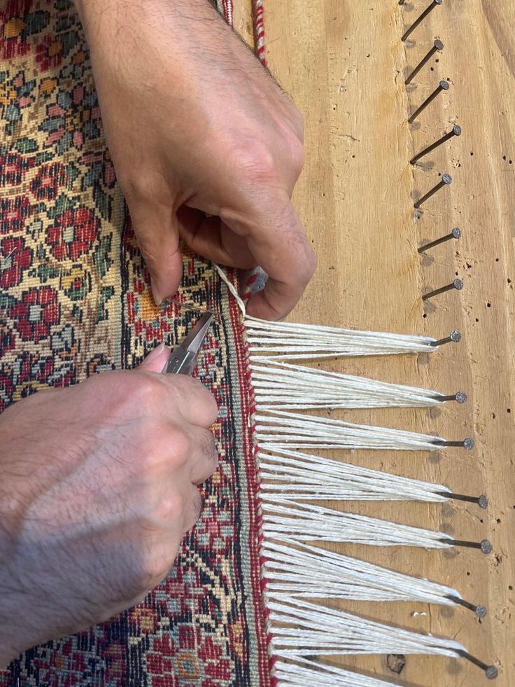 En cas de disparition totale des franges, nous pouvons les reconstruire en prolongeant la chaîne du tapis, garantissant ainsi une restauration fidèle et durable.